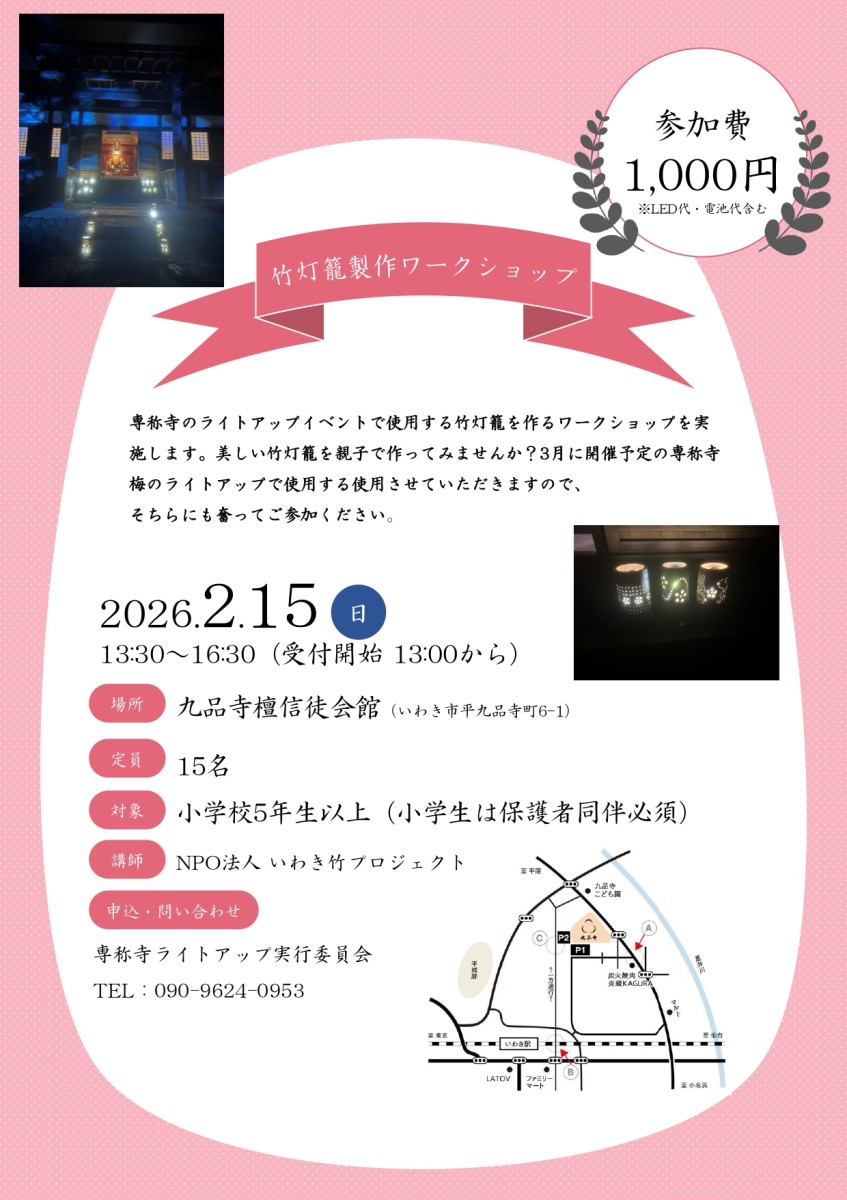 ※制作した竹灯籠は、3月開催の**専称寺「梅のライトアップ」**にて展示・使用いたします。