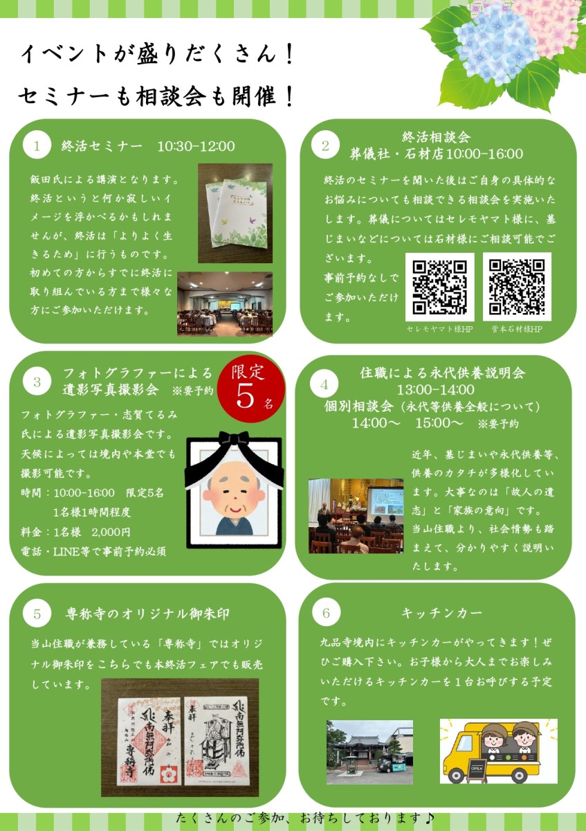 また、当日はキッチンカーの出店や専称寺の御朱印の販売などもございます。