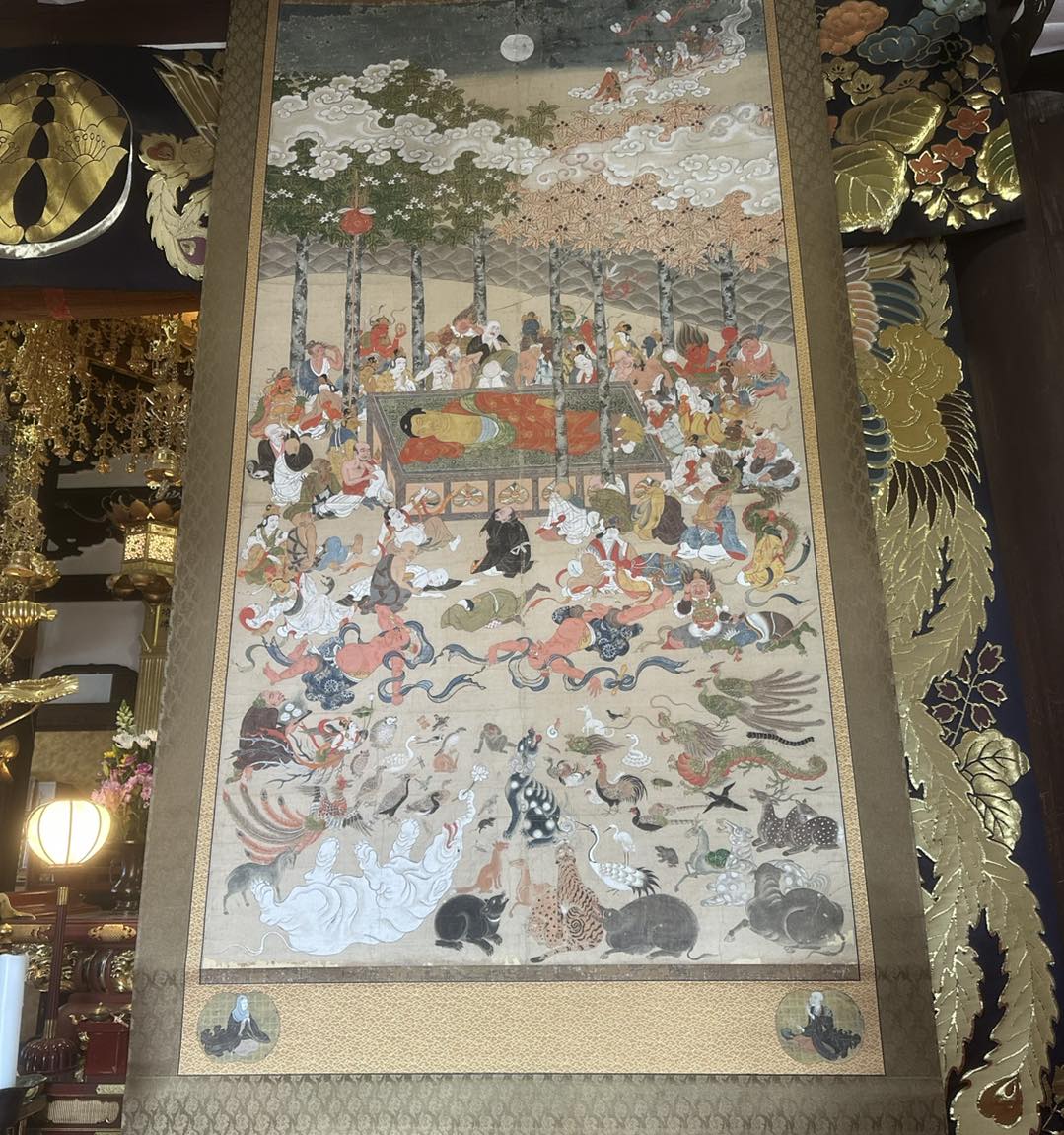お釈迦さまが沙羅双樹の木の下に横たわり、周りにはたくさんのお弟子さんや動物、小さな虫に至るまで、みな嘆き悲しんでいる絵です。