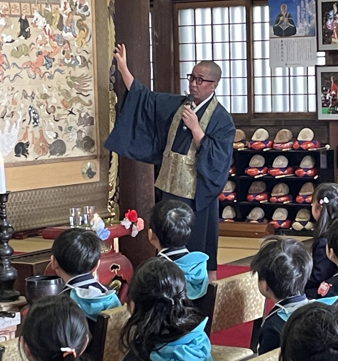 当山住職であり、学園の園長から、お釈迦さまがお亡くなりになる時のお話を聞き、みなさんで「おねはんえのうた」を歌いました。