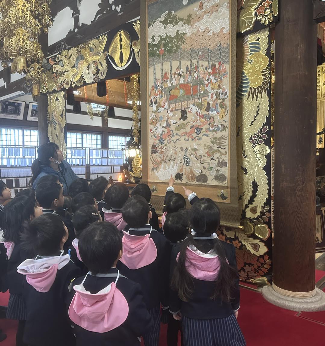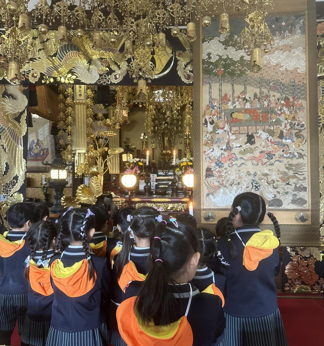 子どもたちの瞳にはどう映ったでしょうか。きっと、一人ひとりの受け止め方は違うでしょうが、園長のお話や「おねはんえのうた」から想いを馳せ、それぞれがお釈迦さまの尊い教えを心に刻み、持ち帰ってくれたことと思います。