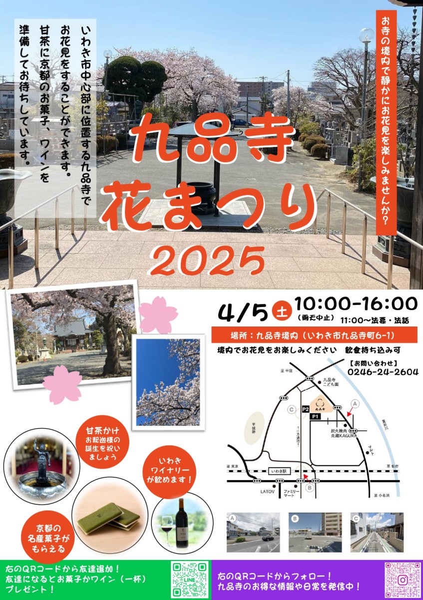 また、境内の桜の木の下や九品寺檀信徒会館には、フリースペースを設置しますので、桜を見ながらそちらでご自由に過ごしていただければと思います。