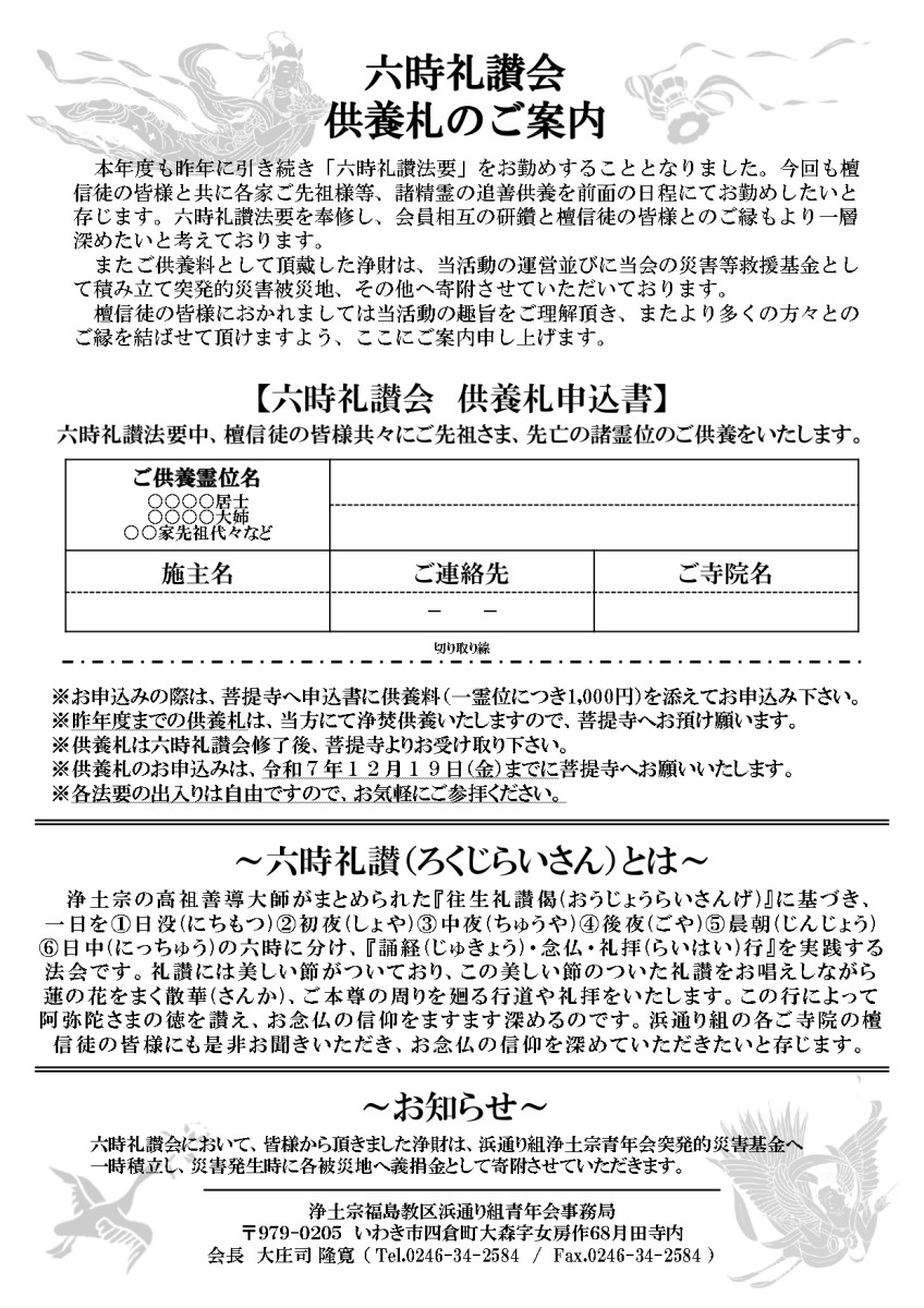 供養札のお申し込みは、添付のチラシに記載いただくか、当山(0246-24-2604)までお申し込みください。