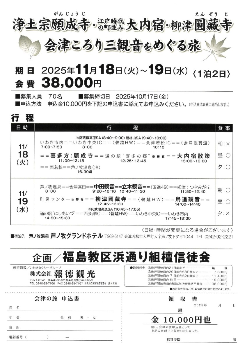 会津喜多方の名刹「浄土宗願成寺」を中心に、大内宿散策や会津三観音をめぐる旅となっております。
