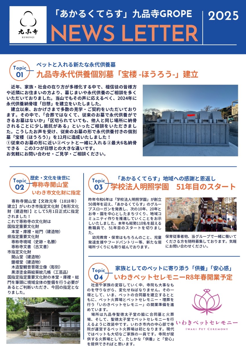 九品寺では、ペットと一緒に入れる新たな永代供養墓「宝楼」の建立や、終活フェアの開催を行いました。